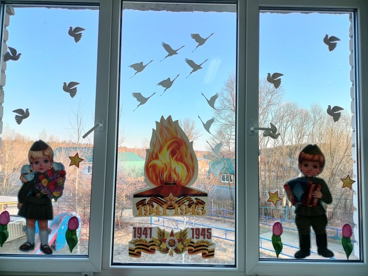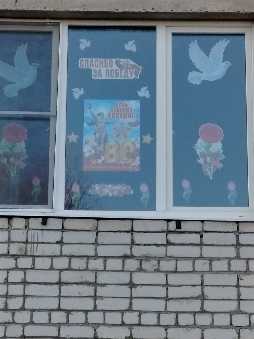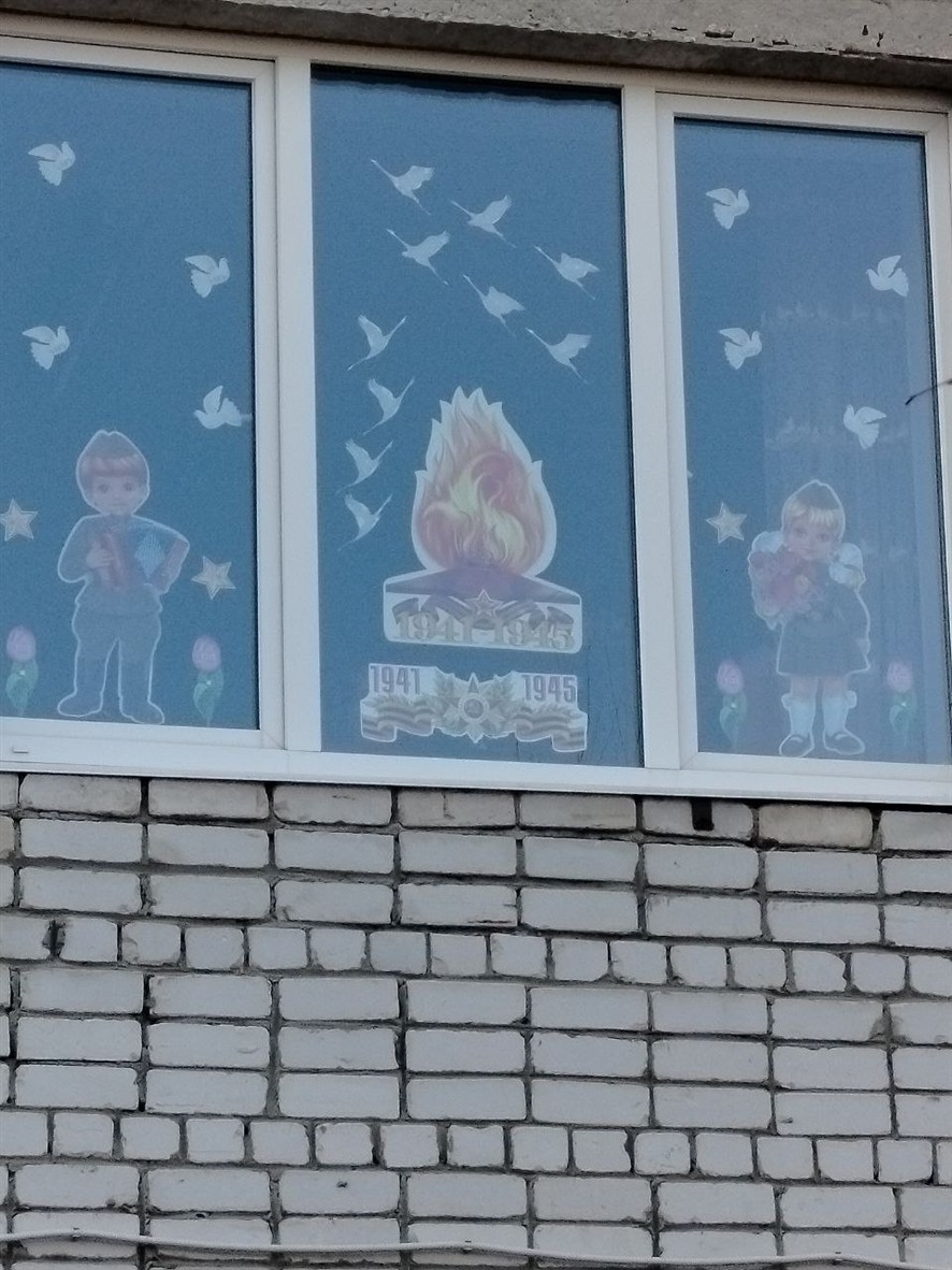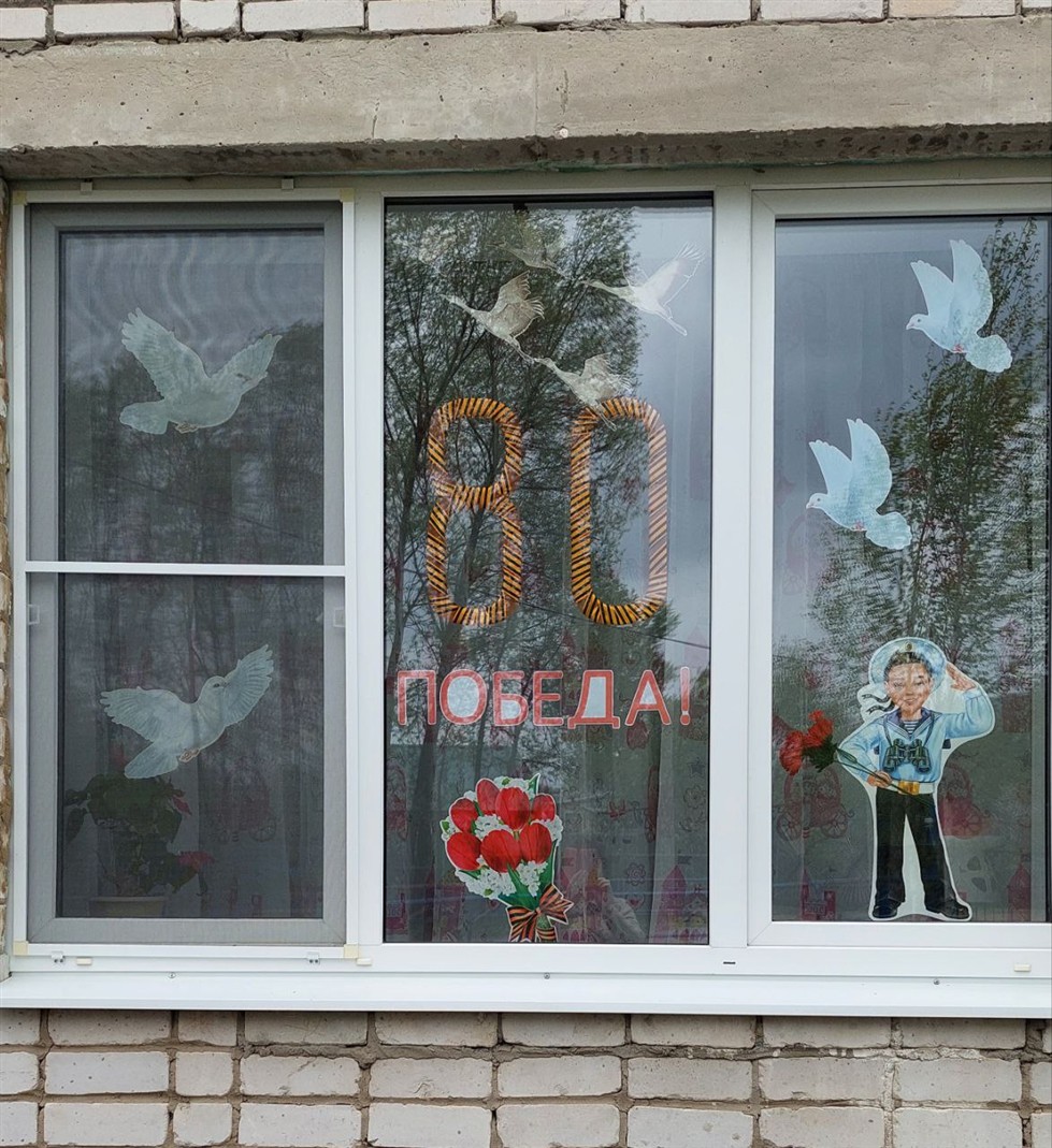 Наш детский сад присоединилась к акции «Окна Победы». Воспитанники и их педагоги украсили окна тематическими трафаретами и символами Великой Победы.